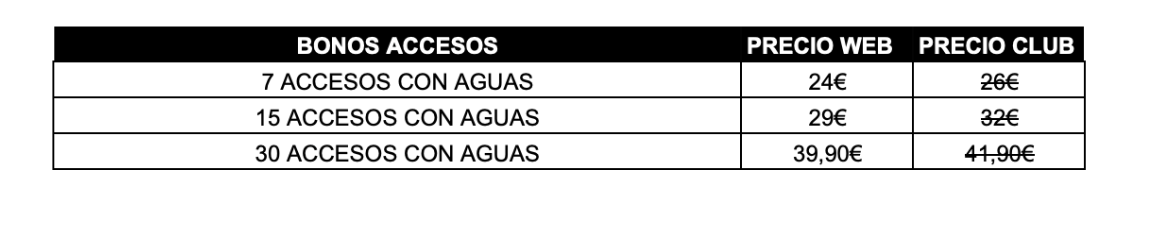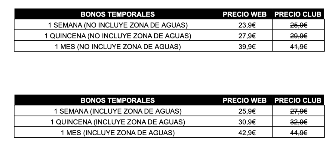 La opción "Pago en el Club" del pedido reservado en la WEB tiene una caducidad de 30 días para ser pagado y canjeado. Tras ese tiempo quedará anulado.◼️ Sólo se puede disfrutar de un máximo de tres Bonos de Acceso o Temporales en el mismo año y por la misma persona.